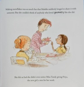 One day in school when Maddie and her classmates are busy making paper snowflakes, she wishes there was somebody with whom she could share her love of geometry. She doesn’t notice that perhaps there is, in the shape of a new girl, Priya; and for the next few days Maddie feels downcast.