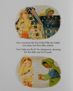 Then one evening Mia notices a face briefly staring out from behind the curtains of the house opposite and during the rainy autumn days she waves at the boy who merely smiles. As winter approaches Mia’s mum suggests bringing the dolls’ house indoors but although Mia agrees, she asks to leave it outside for just one more night. She carefully positions an umbrella over the house – just in case – and the following morning the precious dolls’ house is in rather a state. Then she hears a sound and there is the boy from behind the curtain offering shyly to help her fix the house. In his outstretched hands he holds something special.