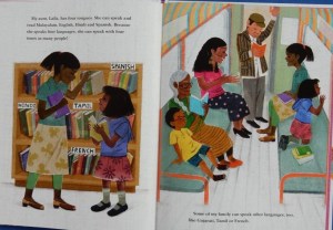 Using canvas backgrounds and quilted textures, Jomepour Bell emphasizes the weaving theme of Uma Menon’s lyrical text in this illuminating book. Everybody should read this especially those who say such things as ‘English is spoken all over the world, so why bother to learn another language.’