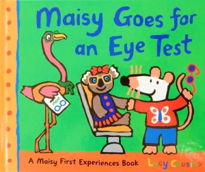 In this 23rd Maisy First Experiences story, young children join Maisy and her friend Ella when they attend the opticians to have their eyes tested for the first time. The reason for the visit is that Ella has trouble reading the number symbols written on the nursery blackboard. On arrival they sit in the waiting room until Flamingo, the optometrist is ready: Maisy goes first and is able to see everything whichever eye she uses. Not so Ella though; the optometrist uses her special machine to look right inside Ella’s eyes and promises to make some specs that will be just right for her eyes. Then with Maisy’s help Ella chooses some frames, the lenses are inserted, and she’s given a case to keep them in. Maisy selects a pair of sunglasses to wear in bright sunshine and with a promise to return for a check-up in a year, off they go , both sporting their new glasses.
