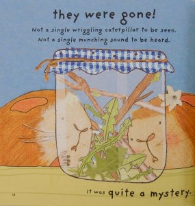 With some lovely descriptions, this delightful story captures the wonder of nature and a life cycle especially well. Children who have already experienced the joys of keeping caterpillars may wonder why Christopher and Posie failed to notice the chrysalises in their jars.