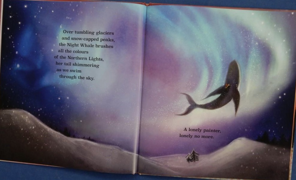 With the Night Whale’s consent, the two mount on her back and with a whistle, whoosh! They ascend, travelling over seas and forest trees, towns and cities all a-twinkle, as far as the Northern Lights