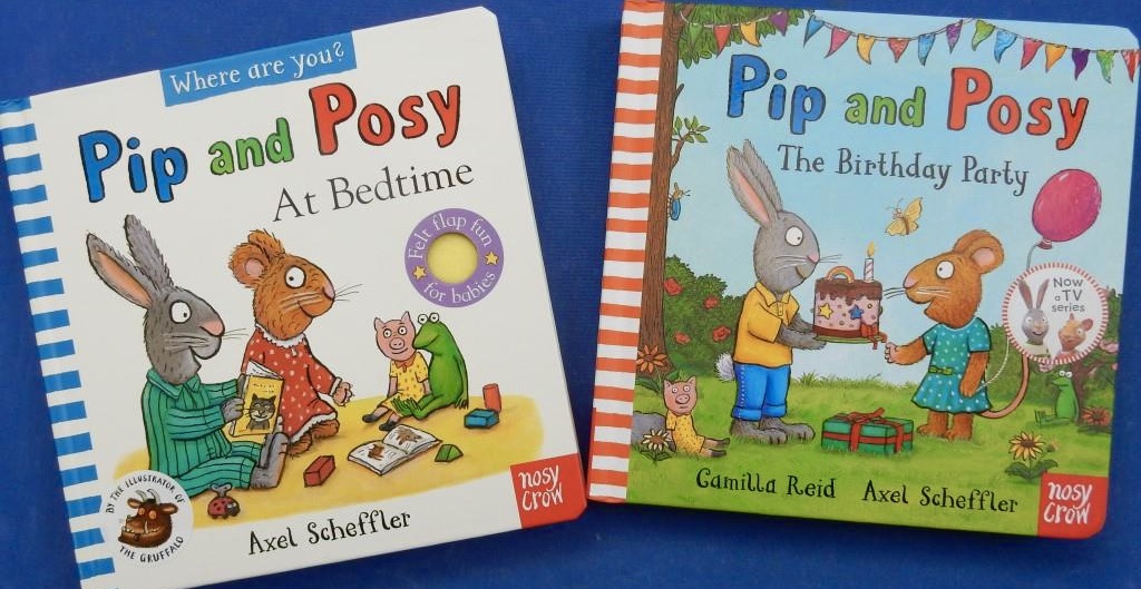 In the second story it’s Posy’s birthday and Pip has come to celebrate with her bringing a present. They have fun playing with Posy’s new toy bus and enjoy lots of party games – musical statues, keepy up balloons, hide-and-seek and pinning the tail on the dinosaur. After all the games the friends sit down for a birthday tea and Pip then goes to fetch a special surprise for Posy but as he approaches the table, he trips on the new toy bus and both he and the cake go flying. Oh goodness me! Posy looks a sorry sight with cake all over her head. After a quick clear up, Pip saves the day with the suggestion of making some new cakes. Yummy cakes for everyone out in the garden.