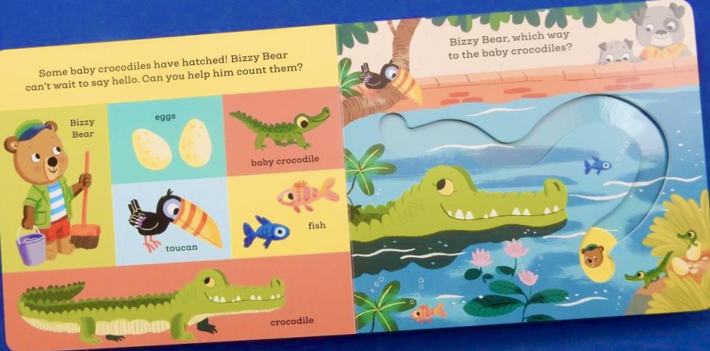 In this Find and Follow book, Bizzy Bear pays a visit to the zoo. He arrives at breakfast time to feed the animals but needs some assistance to find his way around. First it’s the elephants’ turn for some of that yummy fruit from his cart but Bizzy Bear is in need of some help to find his way to the hungry pachyderms so toddlers can guide him and in so doing practise their fine motor skills. Then comes the turn of the crocodiles including the newly hatched babies
