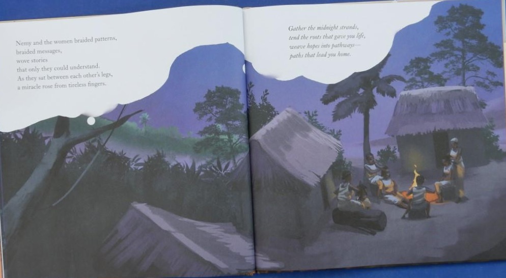 Every morning, Nemy, a child on a plantation walks through the fields scattering seeds, pulling out weeds and stripping leaves. She watches Big Mother hard at work cutting sugar cane, cooking yucca roots and in the evening she listens to her stories before bed. Then one night Nemy follows Big Mother to a shack, outside which sit a group of women braiding one another’s hair. She too has her hair braided, by Big Mother, and it makes her recall her own Nana. Nemy feels part of the community of women that night as she too forms lines of plaits just the way her Nana has taught her and in so doing she evokes the smells of the oils and herbs her Nana used.