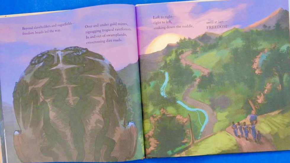 In a final spread, author Monique Duncan explains how her story is based on real life experiences of the enslaved, in particular those in Columbia ,and includes some fascinating information about the meaning of the various styles of hair braiding.