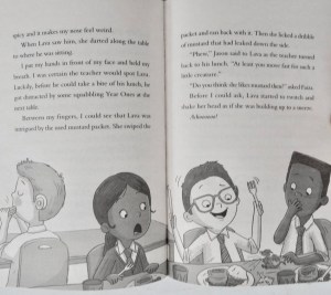 It’s not long before Lava’s mischief making is noticed by George’s school friends; the art lesson rapidly becomes a glitter scattering opportunity for more than the pupils. Before the lesson ends their class teacher announces that there’s to be a school talent show on the coming Friday. George and his pals, Faiza and Jason. sign up to do a magic show using the set George was given for his birthday. George also has to work out what to feed Lava on.