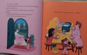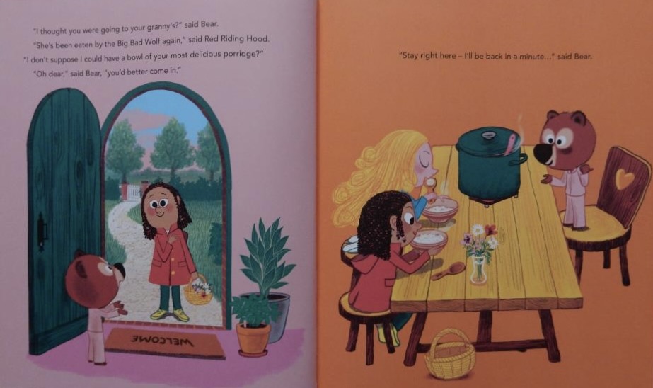 Bear’s feeling frazzled when there comes yet another visitor – Granny supposedly – telling a tale of woe. But suddenly a realisation dawns: ‘THAT WASN’T GRANNY. Red Riding Hood said she was eaten by the Big Bad Wolf’. Time for some quick thinking and a clever ploy from Bear.