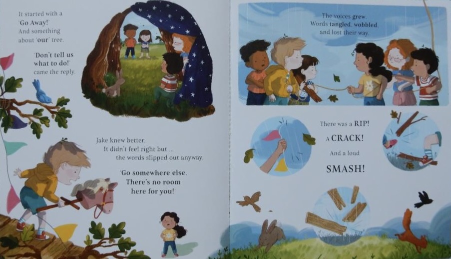However, one morning to their surprise, their place of play is no longer theirs alone: three other children are there. Seeing them as a threat to their private world, Jake et al tell the newcomers to go away. Despite knowing it’s not a kind way to behave, things escalate and the tree house is broken into pieces and silence prevails in their special place.