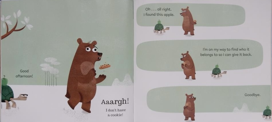 Along come some other creatures and they too like the look of the cookie. A tortoise lumbers up with an apple and what it says might prick the cookie claimer’s conscience, or will it?