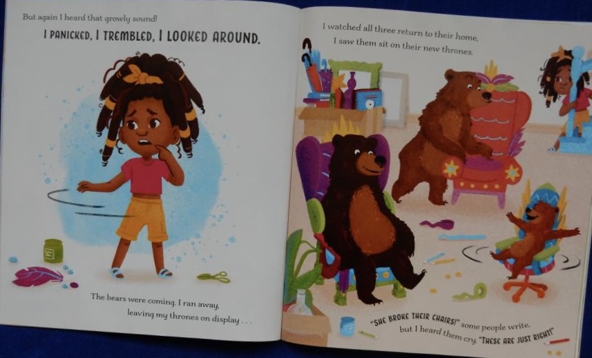 Finally Goldilocs switches to princess mode but soon falls asleep. Back come the bears and terrified of being their next meal Goldilocs declares herself a total failure and tries to run away. To her surprise Baby Bear’s carefully considered words of encouragement make her feel empowered. Her decision? “ … the only rule is that I just be ME. As long as I’m kind and try my best, I don’t need to worry about the rest.” The most important thing to remember is that despite being an imperfect person, she has made three new and very supportive friends.