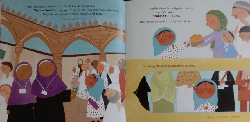 Throughout Mariam’s umrah, she learns ways to express thanks in different languages and samples tasty foods like syrupy koeksisters from South Africa in return, as the pilgrims she meets from many different lands each respond in their own language and share some traditional food, mostly sweet.