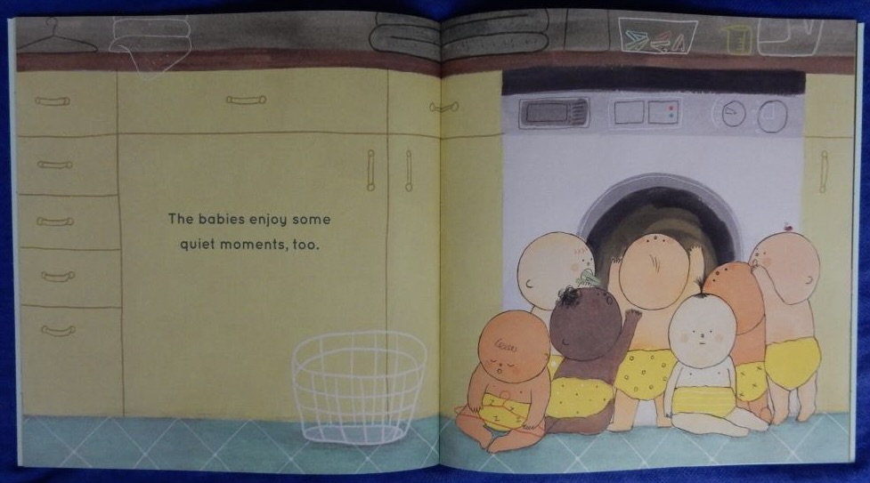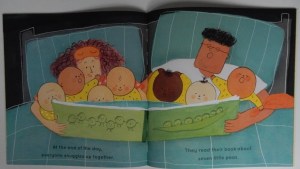 The exhausted couple then fall fast asleep and the exuberant babies depart with their box plus a few items they’ve appropriated – a sock, the woman’s sleeping mask, and the man’s spectacles. With them too are the ladybird (this can be spotted on every spread) and the seven little peas in a pod book that that came with them. The story concludes with a question for readers/listeners, ‘What will they do next?’ – A great opportunity for children to do their own creative storying about the adorable babes.