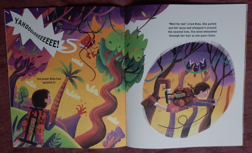 That night Rida recalls Grandad’s remark about there being a ‘ perfectly perfect book for everyone’ . She takes it upon herself to fulfil Arun’s request. Grabbing Grandad’s map she goes on her first visit to the Land of Books, heading to the outermost edge where the book is waiting up in a tree. Rida takes out her lasso, fastens it securely around a nearby tree and chases the book