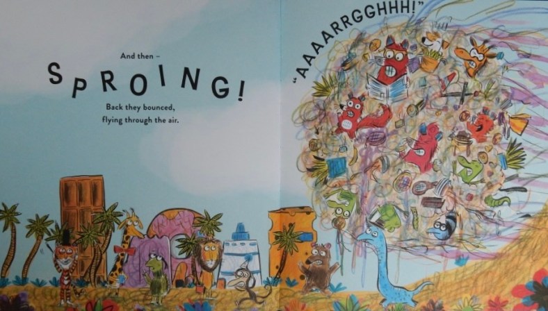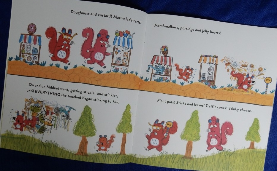 and it’s not so long before having declared herself the stickiest creature in the world, her sticky trail is so huge that arriving at the top of a hill, she trips and tumbles all the way back down – what ‘a big sticky, runaway ball’ she has become. Unstoppable rolling Mildred passes a jelly shop, a glue factory and a glittery quarry as she heads straight for the cliff edge where she grabs a tree and clings on for all she’s worth, stretching and stretching until …