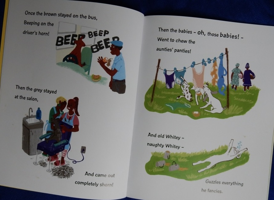 ‘Granny’s got a goat! / Granny’s got a goat! // Not 1, not 2, not 3, /not 4, But more and more / and more and more!’ Granny is sitting on a crate with laundry drying on the line behind her as she looks benevolently at a little white goat. However, every turn of the page reveals more goats engaging in mischief of one kind or another until 99 goats grace the spread, several of which are shown pooing while others cavort on roofs, clamber up trees, chew the pages of books and more: ’20, 30, 40, 50 … / 60, 70, 80, 90 … // Till 99 …’ we read. Where though is Granny’s goat? Imagine what ensues when Granny digs in the garden, visits the tailor, spends a day at church. Moreover on the return journey, one stays on the bus having a great time beeping the driver’s horn; another visits the salon for a trim,