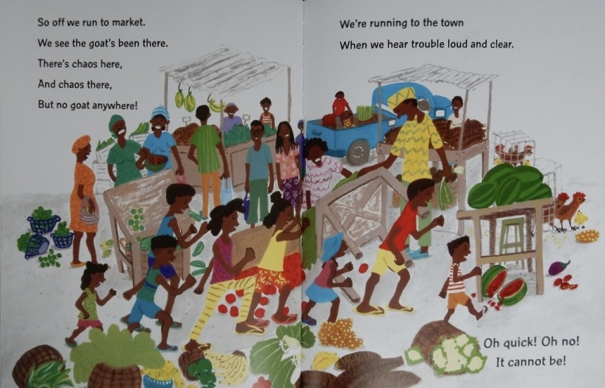 With Atinuke’s playful, rollicking text that cries out for young listeners to join in, and Lauren Hinds’s highly detailed, exuberant scenes both large and small, this book is an absolute delight to share with a pre-school/KS1 class or group. It’s glorious goatish gleefulness.