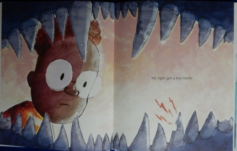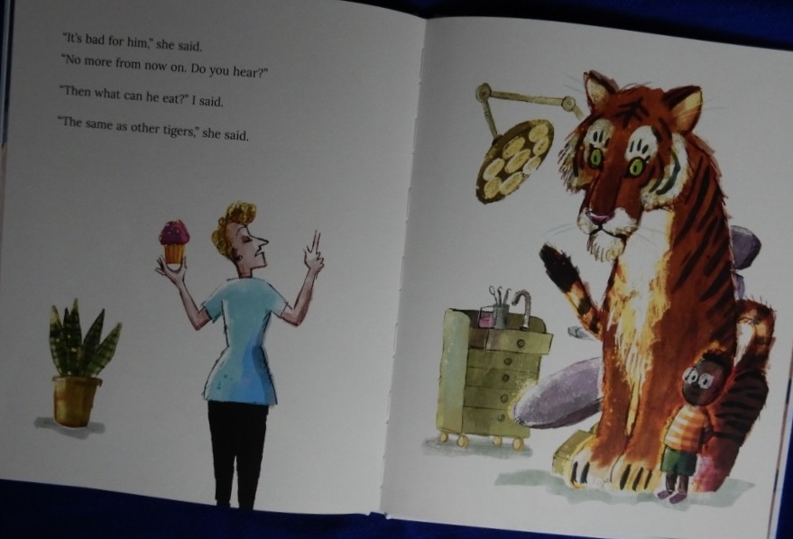 We first encounter the young boy narrator’s tiger as the two of them are wandering down the road just outside a cake shop. The window is full of the tiger’s favourite food: cake. They enter and the baker is anxious to know whether the tiger is dangerous. “He only eats cake”, his friend replies and the feline proceeds to sample some of the cakes. Almost inevitably after a diet of sweet confectionary, the tiger gets a bad toothache.