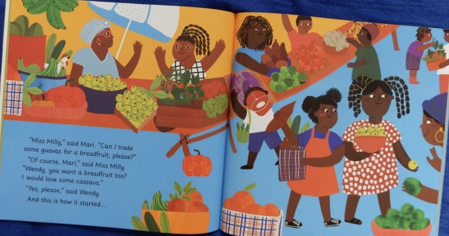 After a while, Mari’s friend Wendy arrives with some unwelcome news: “A sugarcane truck toppled upside down and blocking up de main road. So de customers can’t drive into town.” This meant that if they didn’t sell their goods everyone would struggle the following week. Suddenly though, the enterprising inclinations of Mari and her friend set to work: taking a basket each, they walk along to the ‘top road’ hoping to sell their goods to anyone. However, this is not what happens. Mari tries offering free samples but they have competition in the form of “free cane givin’ way up de road.” Suddenly along comes Granny saying she’s going for the van and what Wendy says next gives Mari her best idea yet. So begins a trading operating that everybody then joins in,