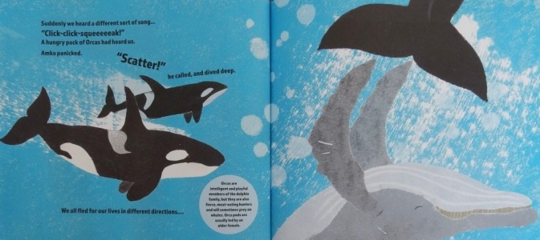 When Uki comes up to breathe, he’s safe but alone save for seabirds so he sings a calling song grandpa had taught him and gradually the pod reassembles but there’s no sign of Amka. Later he’s discovered entangled in a piece of fishing net, deep in the seaweed but the Orcas have found the Humpback pod. “Be brave” was what Grandpa Yuka had told Uki and so he sings loudly causing the Orcas to move right close. However rather than attacking, they follow their queen’s instructions and free Amka in return for something Grandpa Yuka had done long ago. The Orca queen also gives another instruction – what could it have been and will it help the Humpback pod to reach their Polar destination?