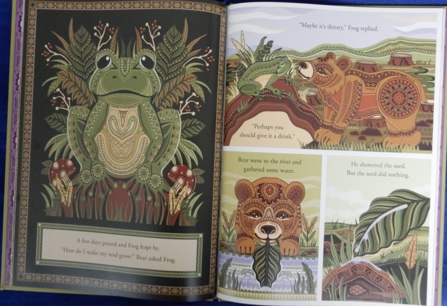 It’s well worth buying this book for its breathtakingly beautiful, intricately patterned illustrations alone. I loved exploring all the mandala-like designs and various shapes that make up the scenes large and small, and the patterns surrounding many parts of the text.