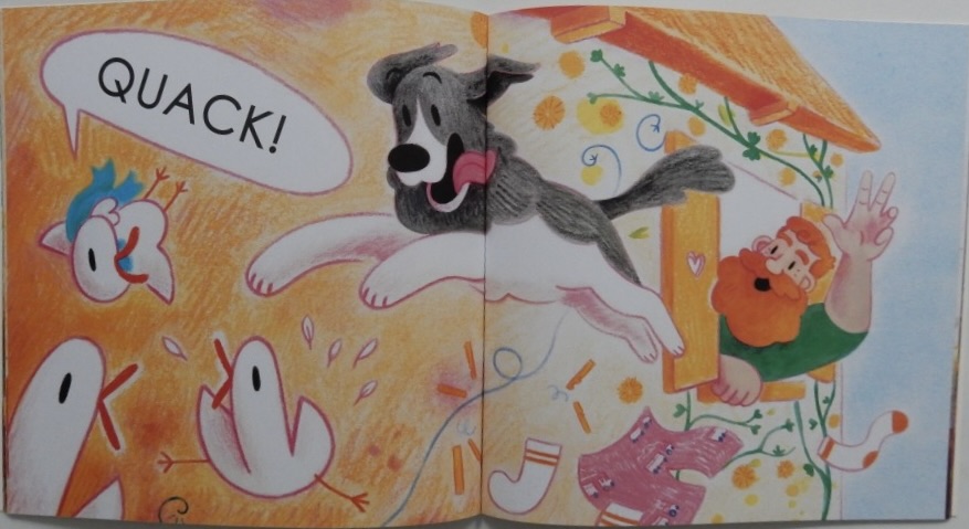 When three little ducks wake up, their Mama is still sleeping so they take advantage of this and sneak put of the duck house to explore the farm. ‘Quietly … Quietly …QUACK!’ On reaching the field they hop along the fence ‘Carefully … Carefully … QUACK!’ Then, eager to smell the farmer’s breakfast but wary of his dog, they sneak along the washing line but emit a loud quack that disturbs said dog.