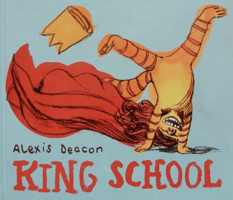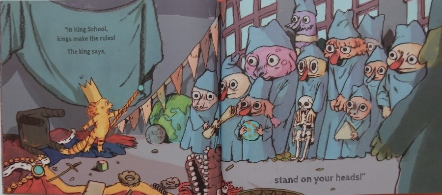 The lively little one is sent to a specially built King School where the instruction is, “Sit still, don’t move, keep quiet and listen.” The little king is then clad in heavy robes and golden chains and told important things about all all his predecessors. However, enough is enough. Our new little king rebels. Tossing off his robes he announces, “In King School, kings make the rules.” and he instructs his subjects to stand on their heads.