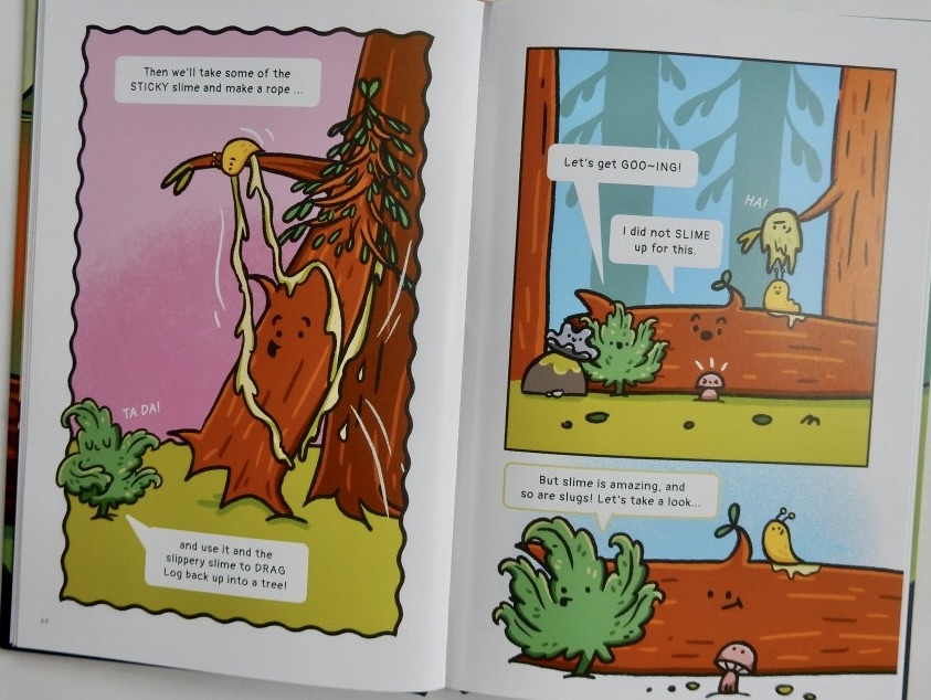 So what about Slug? Slug’s slime (also sticky) gives Fern another idea: using the slippery slime to slide the fallen tree up close to another tree, making a rope from some of the sticky and using it, plus the slippery slime, to drag Log back into a tree again. Ingenious. The team are eager to get “GOO-ING! right away.