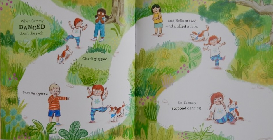 However, when she turned five Sammy noticed that her friends were dressing more modestly causing her to feel silly in her tutu. Consequently she shed her usual gear but when she danced down the path now the other children made fun of her and so she stopped dancing altogether.