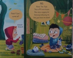 The children disperse and begin finding other things to do and other children to play with. No so Jake though; he stays near to home and can’t stop his mind wandering back to his special friends and the exciting things they’d done together. Eventually he returns to the tree but he’s not the only one who has done so. Lily too has drifted back and, after apologising to one another, little by little a fresh understanding and friendship develops.. Finally, joy of joys, there’s a new treehouse that, as the title says, is for everyone.
