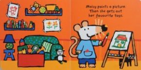 That though is getting ahead of the tale that begins with a warning to Little Mouse to hide inside the blue house. Through the door goes Little Mouse but the door is open wide so another furry creature enters too.