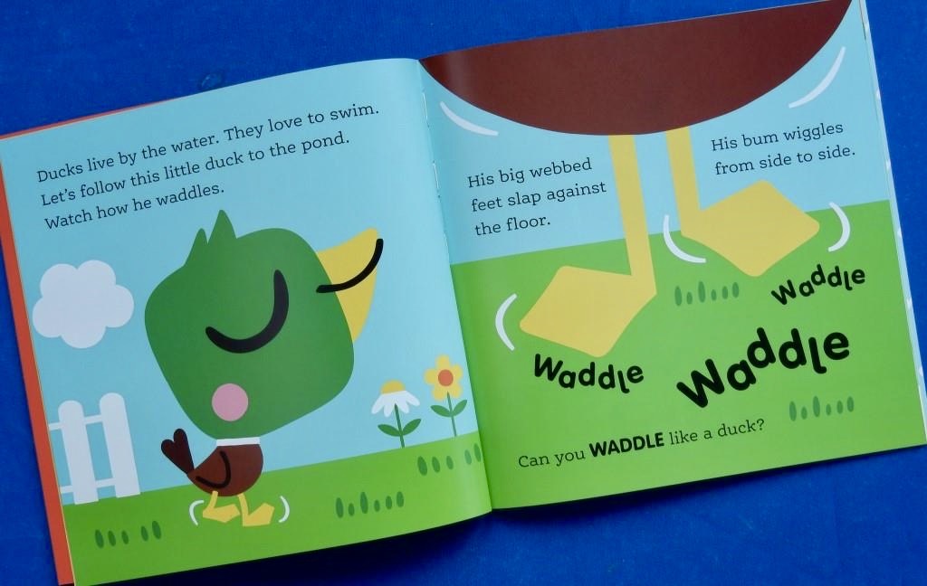 The little duck starts by demonstrating his quacking and then invites little humans to emulate him. We then follow the duck as he waddles to the pond wiggling his bum and slapping his webbed feet against the ground.