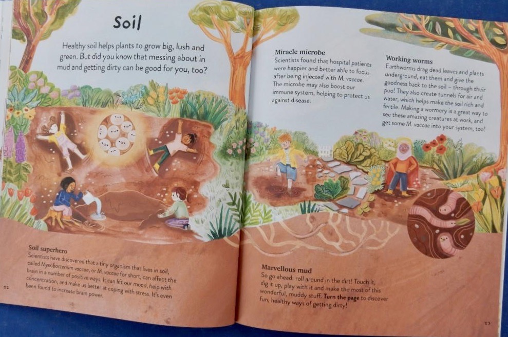 First though the author states that nature has five active ingredients that are of benefit to humans; these will give us more energy, improve concentration and sleep, help us to relax, and to be in a better mood. These include fractal patterns, nature’s sounds, phytoncides (natural chemicals), soil bacteria and sunlight. I expect some of these science terms will be unfamiliar to younger children and Alison pitches her explanations at just the right level. The book has five main sections, entitled Nature’s Fractals, The Science of Sounds, Fresh Air, Soil