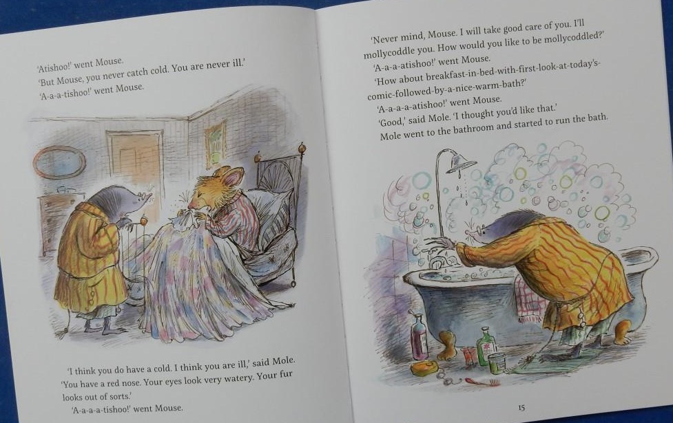 With Bird feeling somewhat better, the two set off for some cloud searching when they come upon a sign, DO NOT GO IN THE HOLE, Bear reads. Off they go again, Bear with his mind on clouds, Bird preoccupied with wondering what his friend is thinking about. Suddenly Bear realises he’s lost Bird and vice-versa. Bird thinks of The Hole. Could Bear be stuck down there? Bird goes to look and finds a stick that’s just right for a rescue.