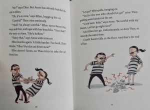 Then comes a knock at the door: it’s the shop owner, Anne Tique and she has a letter she found hidden inside the broken statue. Mysterious clues may show the family how to undo the curse, so following the clues, the Pinchers sneak out at night, into Ark Park zoo. There they have to contend with monkeys and Grizzly Gustavsson, the nasty bearlike zookeeper who makes trespassers spend the night with the poisonous spiders. Will they succeed in their mission? Will Theo ever return to his normal self again? Maybe an encounter with his best pal, police officer Paul Eessman, whistler extraordinaire, will help in this respect.