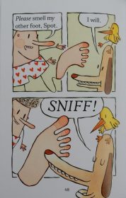 Without further ado let me introduce its comedic duo: Chick is the pedantic, manners obsessed one; The socially inept Brain, despite appearances, can’t quite get the hang of such niceities as ‘please’ and ‘thank you’ and simple greetings, despite Chick’s modelling them for him. Instead of copying, his response is direct action. For instance Chick says, “ But I will not smell your foot until you say PLEASE.’ … ‘Like this ; please smell my foot.’ ‘Oh! OK!’ comes Brain’s response followed immediately by …
