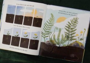 Colours begins with the nursery children and their teachers heading outside to play. The instruction is, ‘Look high, look low. / Look all around!// So many colours/ to be found.’ There are black ants marching across the sand, pink worms wiggling on two children’s hands, a red slide, a blue swing and a purple bar to swing along, as well as a wonderfully messy opportunity to use mud and leaves to create mudpie faces. Meanwhile at the water tray a floating and sinking activity has yellow, orange and white objects to test. Then just before snack time everybody blows bubbles with rainbow colours. The final spread encourages interactive learning with a ‘can you find’ showing all the coloured items featured throughout the book.