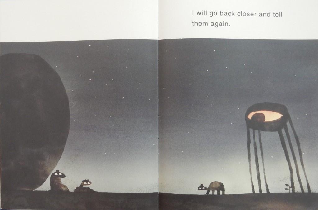 The story concludes with a community celebration with everybody gathering up on the hill to view the wonders of the night-time sky, now filled with stars,
