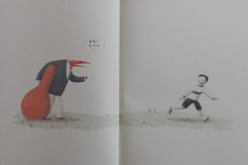 This wordless story really begins on the title page where we see a group of fourteen animal friends gathered for a picnic. Down swoops an eagle and snatches up the outspread blanket on which are the animals’ belongings – a hat, a football, a toy sword, a small soft toy, a parasol and various other bits and pieces, plus a cake. The animals give chase and suddenly a heron goes for the thief causing it to release the blanket with the result that its contents are scattered far and wide landing in various places on the cliff, in the water and up a mountain.