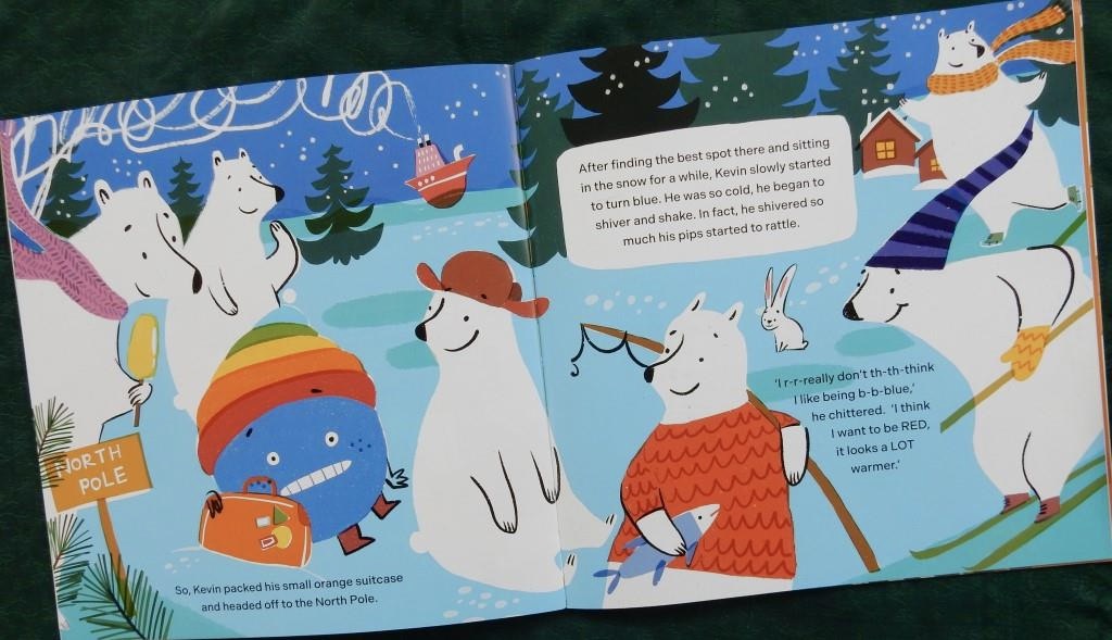 One day Kevin the orange’s best fruity friend Brian the pear – a wise bibliophile by nature – discovers that Kevin is having a colour crisis. Fed up with a life that seemingly lacks fun, he’s decided to turn blue. But how? Brian suggests that by visiting the North Pole and immersing himself in the snow for some time, he will become blue. Suitcase in hand, off goes Kevin.
