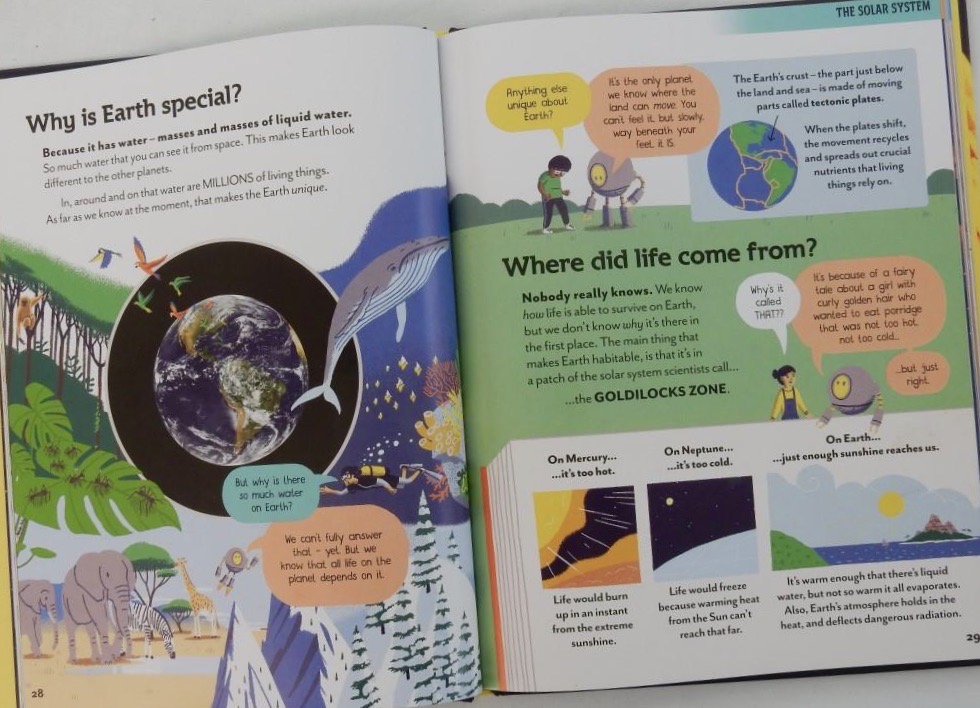 The next chapter is devoted to the solar system. Did you know that 1300 Earths could fit inside Jupiter, or that astronomers have discovered over 200 moons in our solar system and that Jupiter has at least 80 of them? So far as we know Earth is unique in having so much water: why this is so is a tricky question and it leads on to a mention of what scientists call the Goldilocks zone – I love that name.