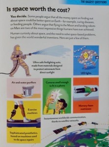 Stars and their secrets has a whole chapter, as does ‘People in space’ and ‘The Biggest questions’ are left to the last chapter. I like the way readers are left to answer for themselves whether or not the vast amount of money spent on space research is worth it; what the authors do is put forward the spin-offs such as air and water purifies, mobile phone cameras and instantaneous world-wide communication through satellite networks.