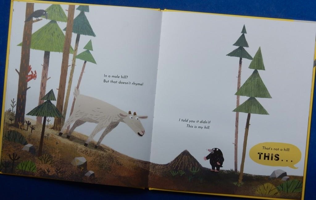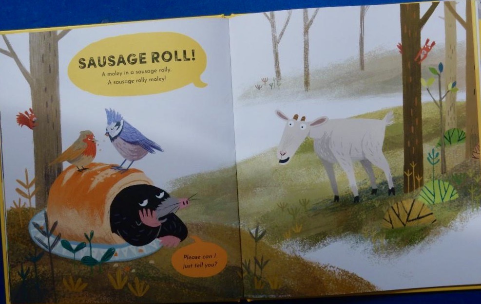 Gus the Goat must surely be in the majority when, on encountering a mole who introduces herself as Mavis, he guesses that she lives in a hole. ‘A mole in a hole. / A moley in a holey / A holey moley!’ Not so however; and there follows a hilarious exchange between the two characters with Gus suggesting various other places where Mavis must live and the mole naysaying each one. It’s certainly not on a pole, nor in a sausage roll,