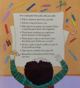 the notion of happiness; dealing with emotions; coping with feelings of anger, sadness and fear; coping with negative thoughts that seem overwhelming (suggestions to prevent ‘ruminating’ and instead focusing on being in the moment); dealing with upsets triggered by another person (forgiving is important here).