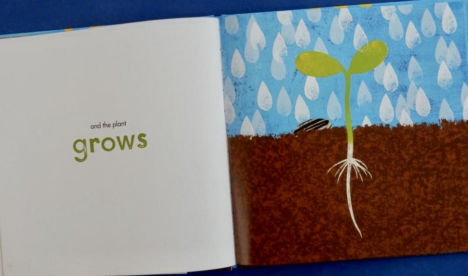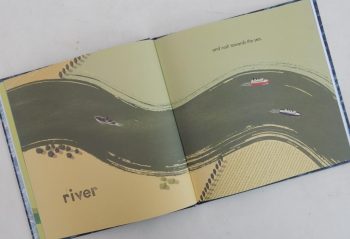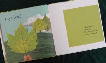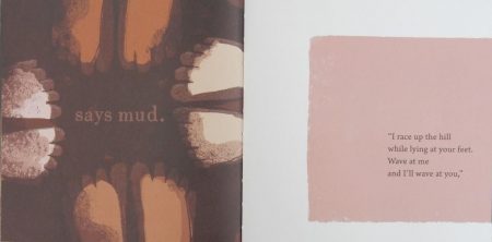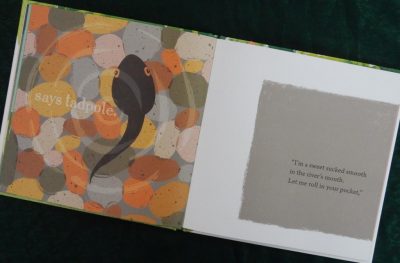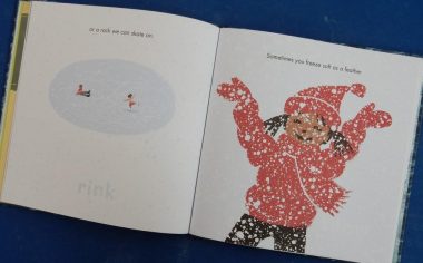 On the first spread readers will find a small orange rectangle containing a smaller black circle and at the bottom of the right page are two little green dots, one labelled ‘power’, the other ‘auto translate’. A turn of the page shows a larger central rectangle within which is a large eye with a black pupil and orange iris. A couple of page turns on a portal opens up to reveal two extraterrestrial beings – Blrg, (with yellow skin) and Zrk (with orange skin). At first these two creatures are petrified concluding “Aliens are real!!!”