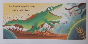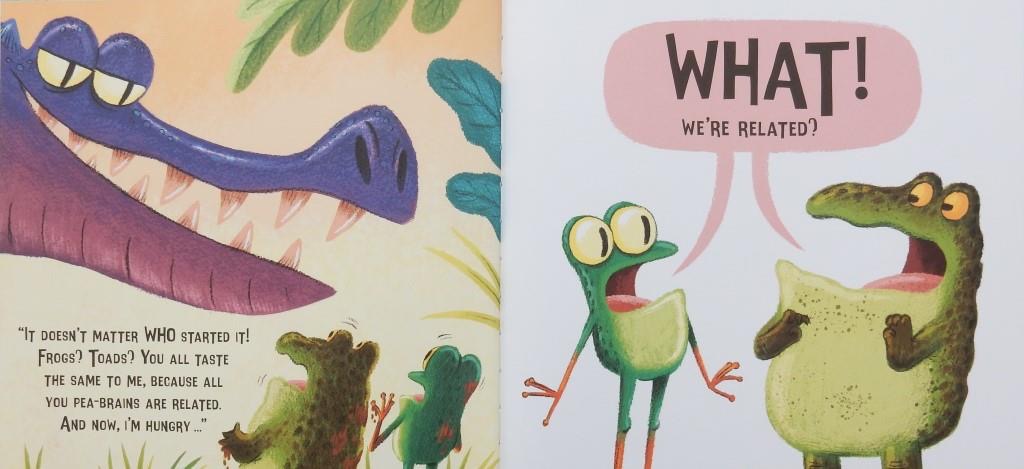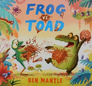 Both sides are so busy SLIP! SPLAT! SPLOTCHING and SQUELCHING that they fail to notice the approach of a large grumpy reptile displeased at being aroused from its slumbers. Quick to jump to their own defence Frogs and Toads blame one another but the jagged-toothed creature tells them something that comes as a huge surprise.