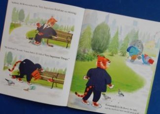 The large ursine character in this rhyming story is badly behaved and rude: worst of all though is his frequent playing of his “Hide and Scare” game. This involves hiding behind a tree and then leaping out and roaring at unsuspecting passers by.
