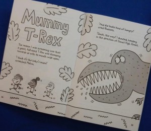 Well that would be telling, and I’ll leave Jim Smith’s young narrator to do that in his own inimitable way and merely say that what follows is seriously silly and huge fun especially with daft cartoon style drawings adorning every spread adding to the overall wackiness.