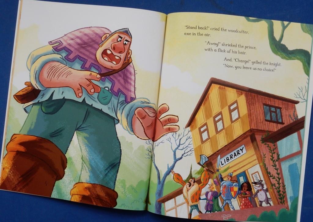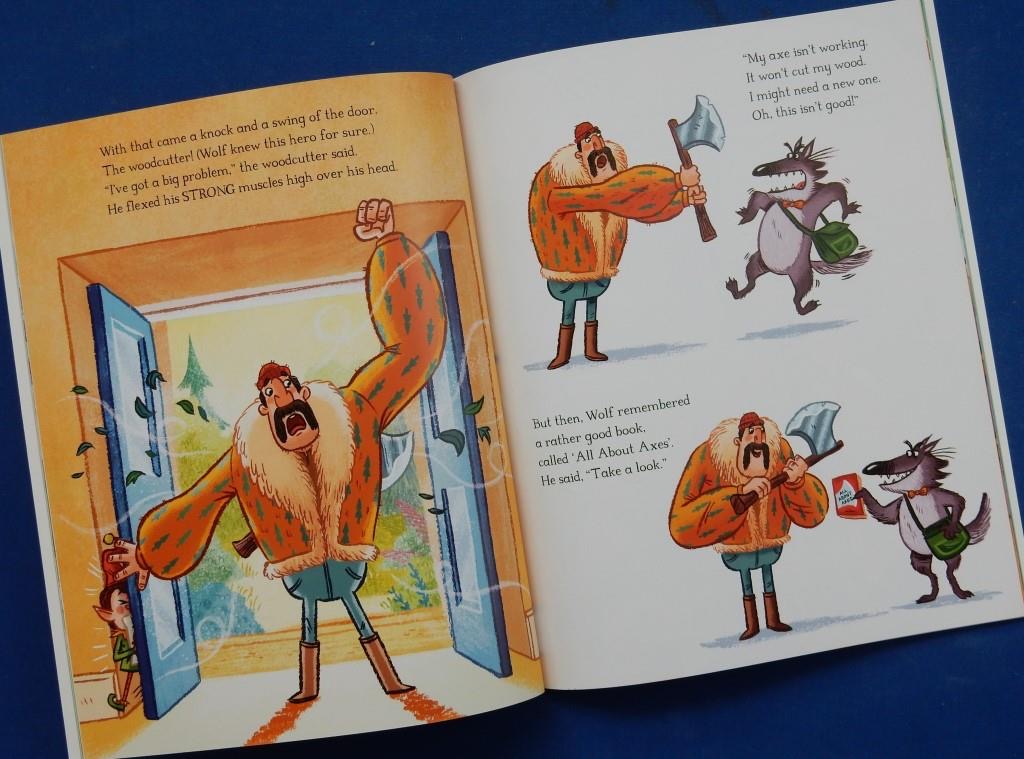 One day however, he pays a visit to the library looking very downcast. He’s come to the realisation that no matter what kind of heroes he meets in the books he reads there’s never, ever one of the lupine variety: wolves are always portrayed as the baddies. The librarian makes a suggestion: write the kind of story you want to read. Do I have what it takes, he wonders, far from sure. Then into the library storms a woodcutter with a blunt axe.