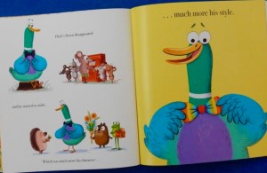 Kaye Umansky’s rhyming text bounces – or should that be – waddles – merrily along and reads aloud well so long as you can get your tongue round those Duck Dick and Dick Ducks. Ben Mantle’s splendid illustrations of Dick Duck et al are an absolute delight – funny and bound to make you quackle. You’ll need to grab a copy of the book to discover what a quackle is, but it’s well worth so doing as it offers plenty for young listeners to enjoy.